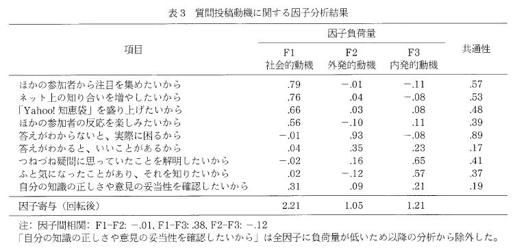 「社会的動機」「外発的動機」「内発的動機」の3タイプに分かれています。分散分析によって、属性との関連も検討されています(省略)。