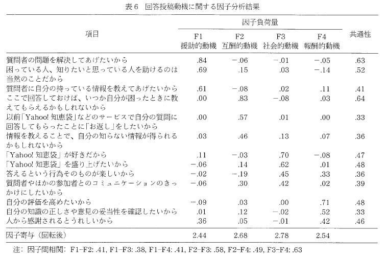 ・投稿数に基づく分析では、投稿された質問に対して何らかの回答がなされ、さらに多くの場合、それは複数寄せられていた。回答投稿の主な動機として「援助的動機」が、参加スタイルを問わず、共通に挙げられていた。これらの結果は、知恵袋というQ&Aコミュニティでは、積極的かつ協力的な対人コミュニケーションが展開されているようすを示している。