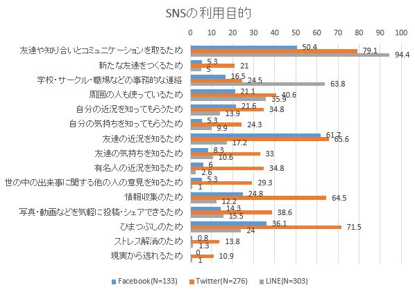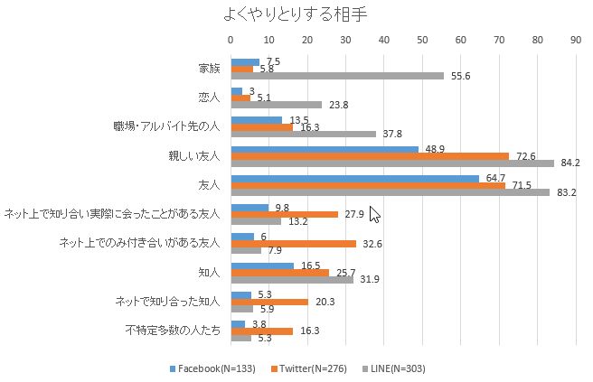 この尺度とFacebook、Twitter、LINEの利用頻度との相関を計算してみたところ、いずれも有意な正の相関がみられた。つまり、デジタルネイティブ度が高い人ほど、Facebook、Twitter、LINEの利用頻度が高くなるという関連が認められたのである。 言い換えると、デジタルネイティブ度の高い人ほど、SNSを活発に利用しているというユーザー像が鮮明になったといえる。