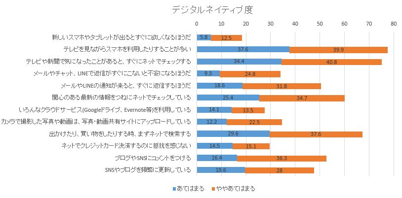 これらの先行研究を参考に、「デジタルネイティブ度」を測定するための質問項目を作成してみた。これらの項目について、「あてはまる」「ややあてはまる」と答えた人の比率を計算してみると、次のような結果が得られた。調査対象は、デジタルネイティブの世代である。第1因子は、「ブログやSNSにコメントをつける」「SNSやブログを頻繁に更新している」「カメラで撮影した写真や動画は、写真・動画共有サイトにアップロードしている」の3項目で因子負荷量が高い。これは「情報発信」因子と名づけることができるだろう。第2因子は、「テレビや新聞で気になったことがあると、すぐにネットでチェックする」「関心のある最新の情報をつねにネットでチェックしている」「テレビを見ながらスマホを利用したりすることが多い」の3項目で因子負荷量が高い。これは、「マルチタスク」因子と呼ぶことができるだろう。第3因子は、「ネットでクレジットカード決済をするのに抵抗を感じない」「いろんなクラウドサービスを利用している」「新しいスマホやタブレットが出るとすぐに欲しくなるほうだ」で負荷量が高い。これは、「イノベータ度」と呼ぶことができよう。第4因子は、「メールやLINEの通知が来ると、すぐに返信するほうだ」「メールやチャット、LINEで返信がすぐにこないと不安になるほうだ」の2項目で因子負荷量が高い。これは、「スピード」因子と名づけることができるだろう。こうしてみると、プレンスキーの指摘するデジタルネイティブの特徴をある程度反映した結果と考えることができるだろう。タプスコットは、デジタルネイティブの行動基準の一つとして、「イノベーター」性をあげており、これは本調査の結果とも一致する。