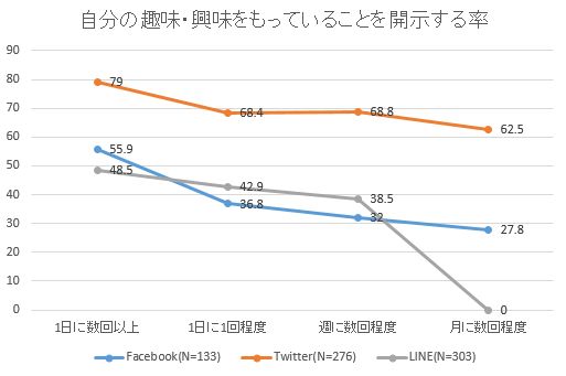 次に、Facebookでの情報開示度を従属変数とし、Facebook利用頻度、デジタルネイティブ度、性別、年齢を独立変数とする重回帰分析を行ったところ、もっとも大きな有意な偏回帰係数を示したのは、デジタルネイティブ度であった(β=0.382)。Twitterでの情報開示度を従属変数として、Twitter利用頻度、デジタルネイティブ度、性別、年齢を独立変数とする重回帰分析を行ったところ、もっとも大きな有意の偏回帰係数を示したのは、やはりデジタルネイティブ度であった(β=0.301)。いずれの場合にも、SNS利用頻度は有意な影響を示していなかった。つまり、SNSの利用頻度よりも、デジタルネイティブ度のほうが、SNSでの情報開示度に対し、大きな関連をもっていたのである。