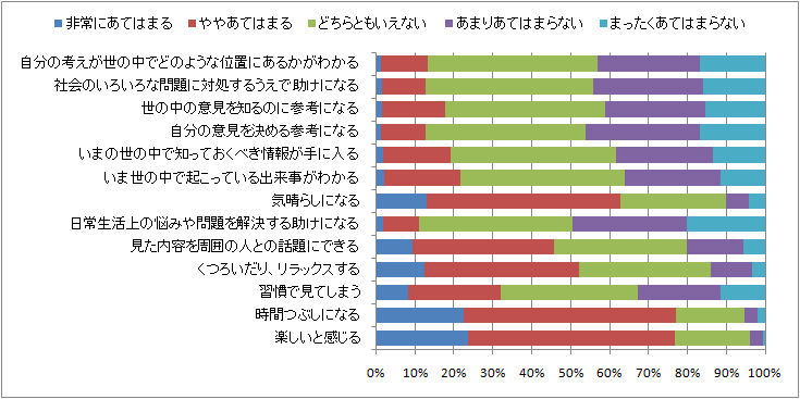 第1因子は、「社会のいろいろな問題に対処するうえで助けになる」「世の中の意見を知るのに参考になる」など教育的、実用的な項目が高いのに対し、第2因子は、「くつろいだり、リラックスできる」「楽しいと感じる」など娯楽的な機能が強くなっています。